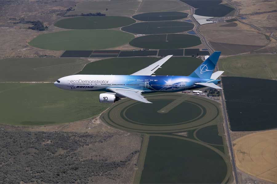 تعليق على الصورة: سيختبر برنامج بوينج ecoDemonstrator خلال عام 2024 حوالي 36 تقنية جديدة، في السنة الثالثة من الاختبار على طائرة 777-200ER (على المسار الطويل)،